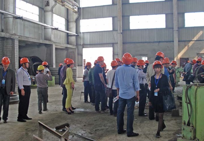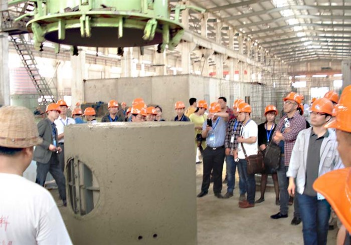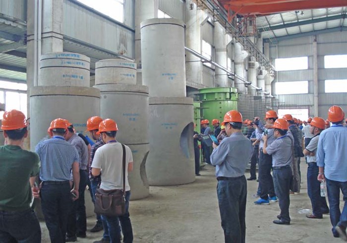 會議代表在南寧鴻基水泥制品有限責任公司參觀了由我公司芯模設備生產(chǎn)的帶底座混凝土整體檢查井工作現(xiàn)場;并對生產(chǎn)工藝裝備等技術進行了研討和專家答疑。